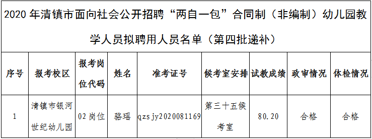 2020年清鎮(zhèn)市招聘兩自一包合同制幼兒園教學人員擬聘用名單(第四批遞補)