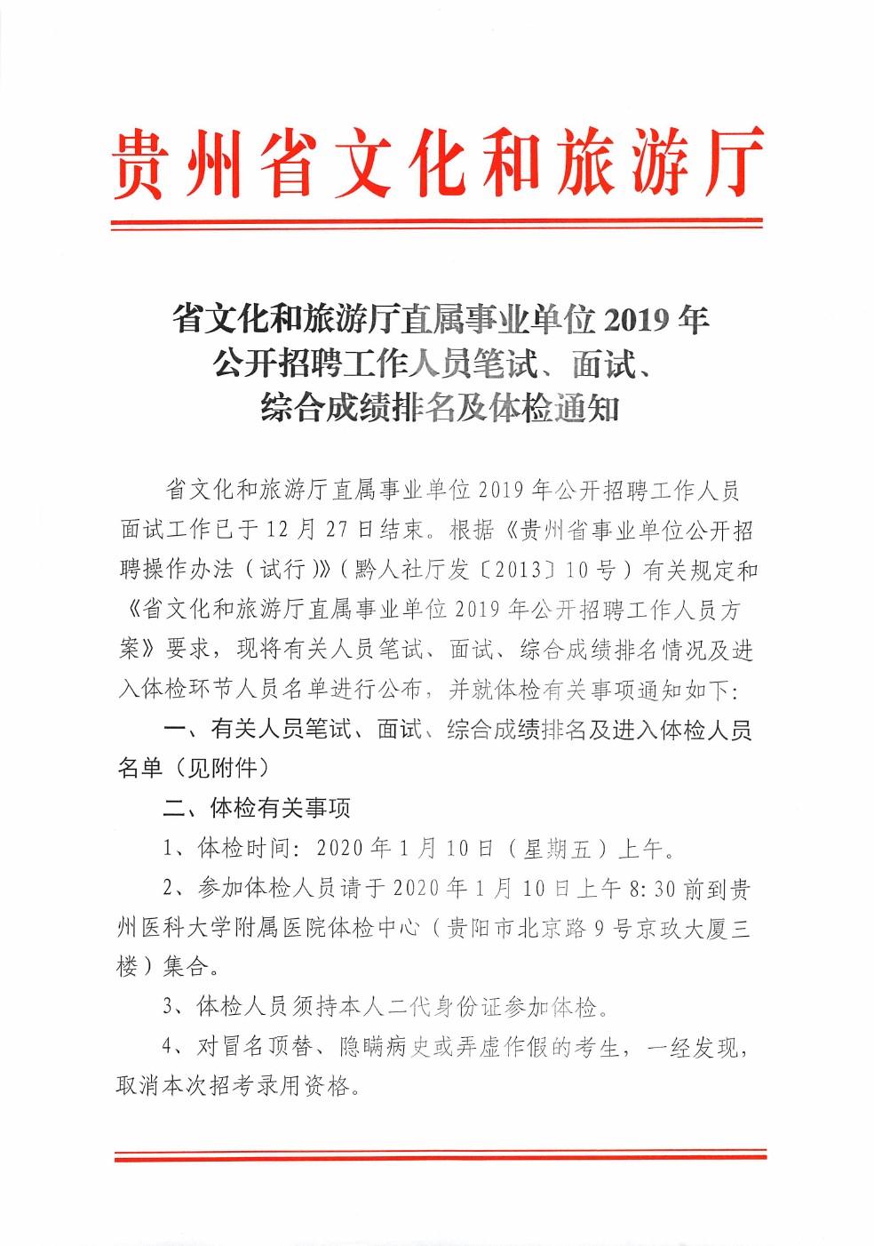 省文化和旅游廳直屬事業(yè)單位2019年公開招聘工作人員面試工作已于12月27日結(jié)束。根據(jù)《貴州省事業(yè)單位公開招聘操作辦法(試行)》(黔人社廳發(fā)〔2013〕10號(hào))有關(guān)規(guī)定和《省文化和旅游廳直屬事業(yè)單位2019年公開招聘工作人員方案》要求,現(xiàn)將有關(guān)人員筆試、面試、綜合成績(jī)排名情況及進(jìn)入體檢環(huán)節(jié)人員名單進(jìn)行公布,并就體檢有關(guān)事項(xiàng)通知如下: