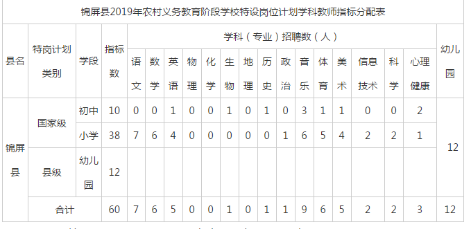 詳見(jiàn)“錦屏縣2019年農(nóng)村義務(wù)教育階段學(xué)校特設(shè)崗位計(jì)劃學(xué)科教師指標(biāo)分配表”(附表)。