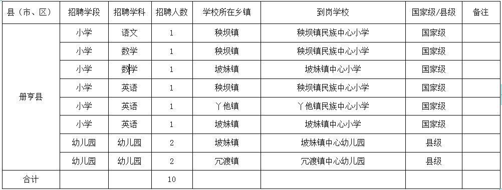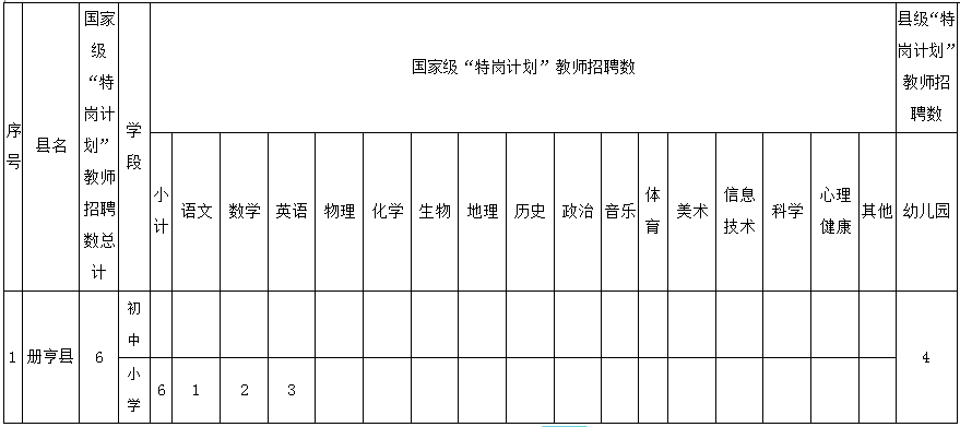 冊亨縣“特崗計劃”指標10名(其中國家“特崗計劃”指標6名、縣“特崗計劃”指標4名,具體指標分配詳見細則附件2)。