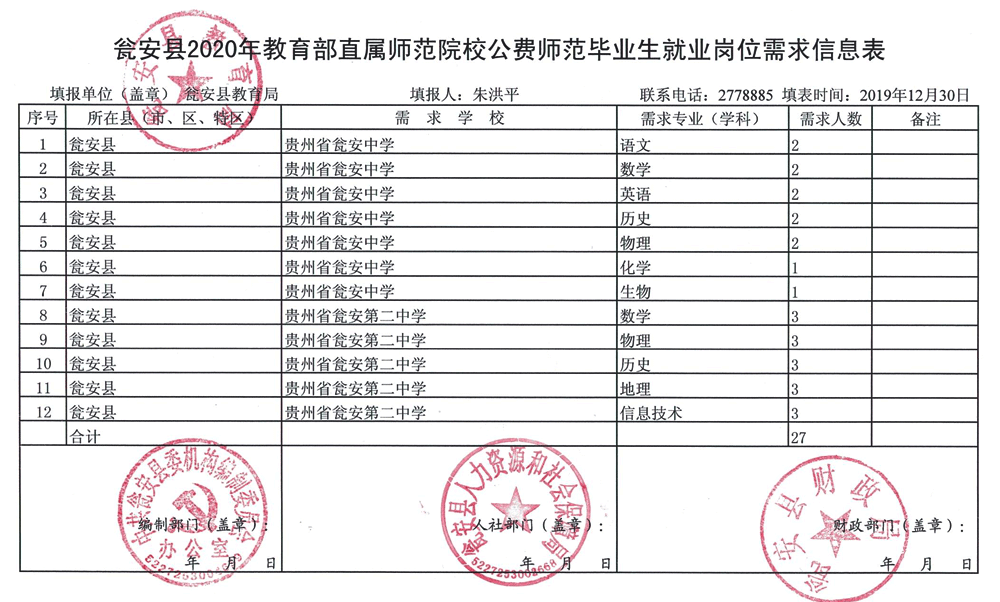 為加強甕安縣教師人才隊伍建設,優(yōu)化人才結構,根據(jù)《教育部直屬師范大學師范生公費教育實施辦法》(國發(fā)〔2018〕75號)文件精神,結合我縣高級中學空崗和人才需求情況,經甕安縣人民政府同意兩所高中(貴州省甕安中學、貴州省甕安第二中學)引進部屬師范大學公費師范畢業(yè)生,充實高中教師隊伍,特制定此招聘簡章。